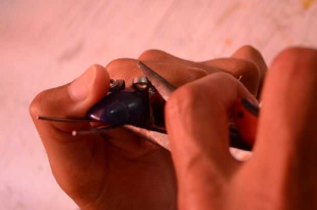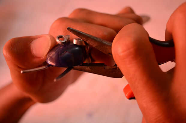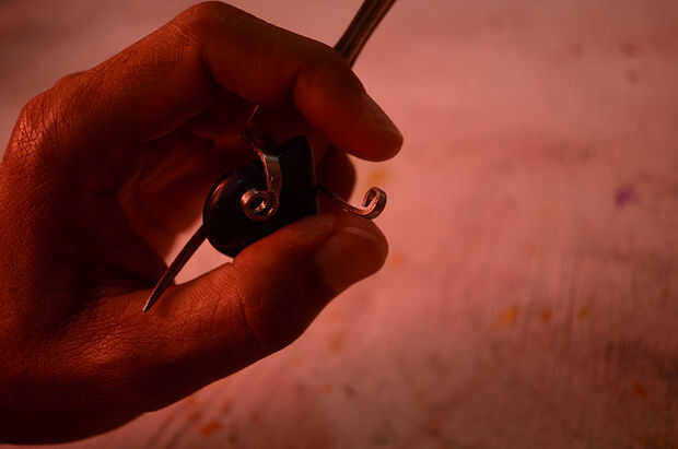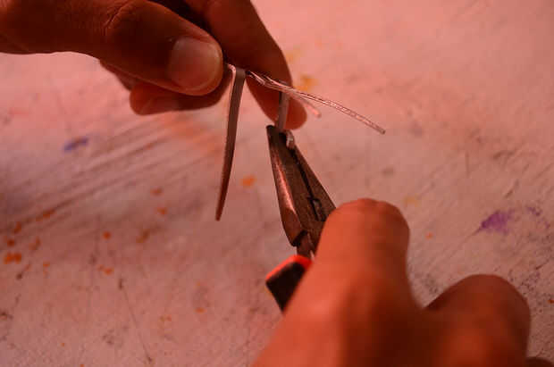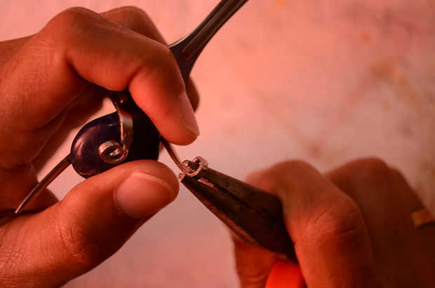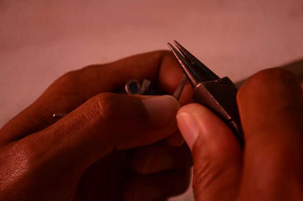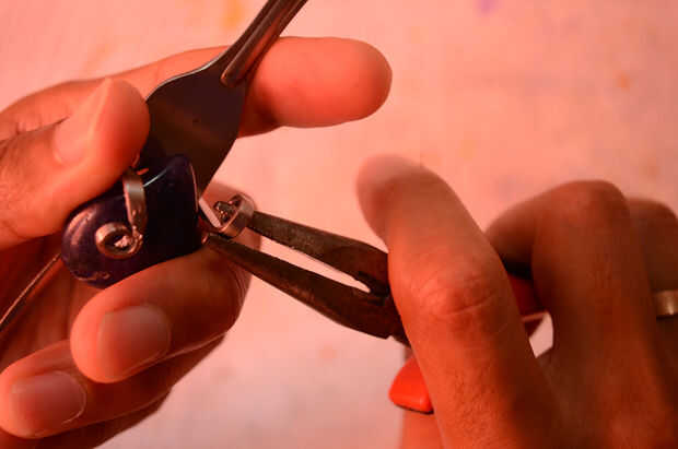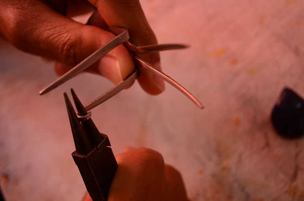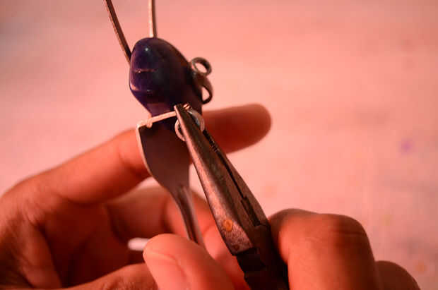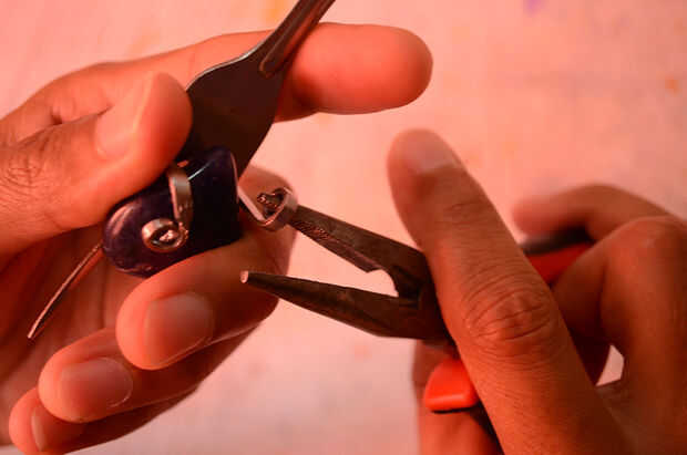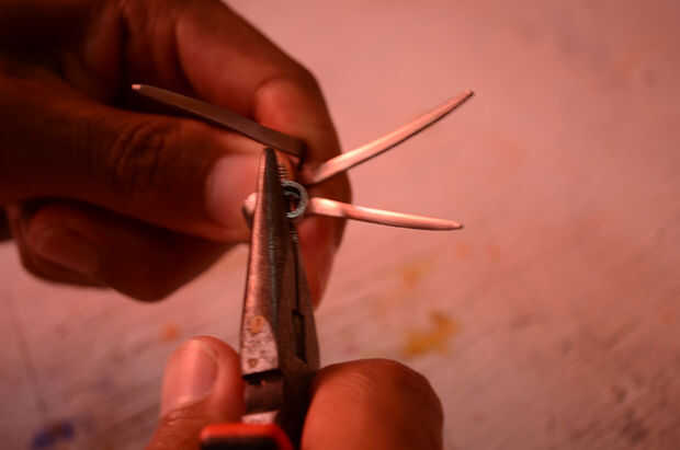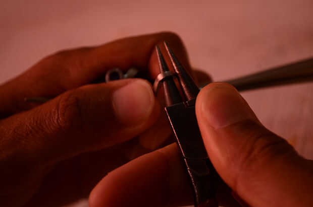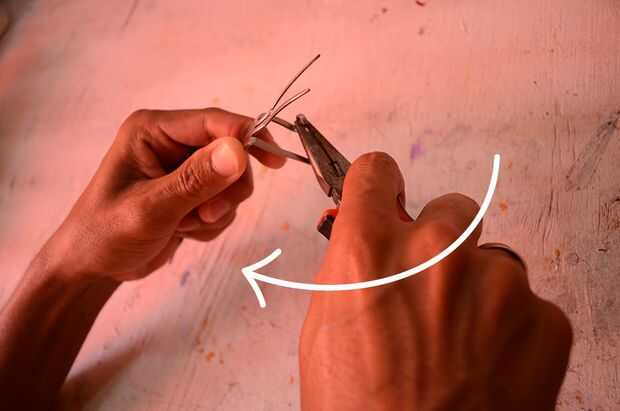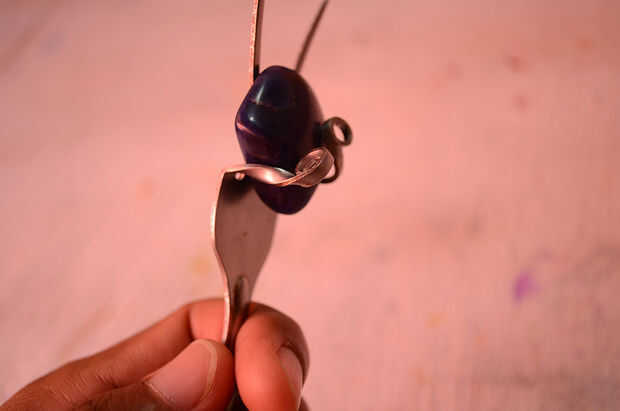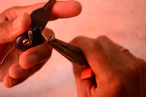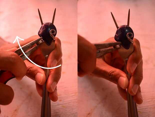 Utilice las pinzas de nariz redondeada para hacer la primera vuelta de la espiral y los alicates de punta para hacer los otros giros. No leer el diente entero, dejar llana una pieza. El tamaño de esta pieza depende de la altura de la piedra preciosa.