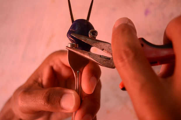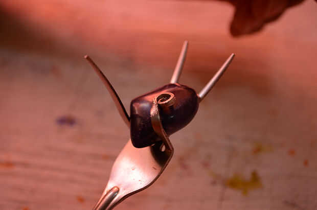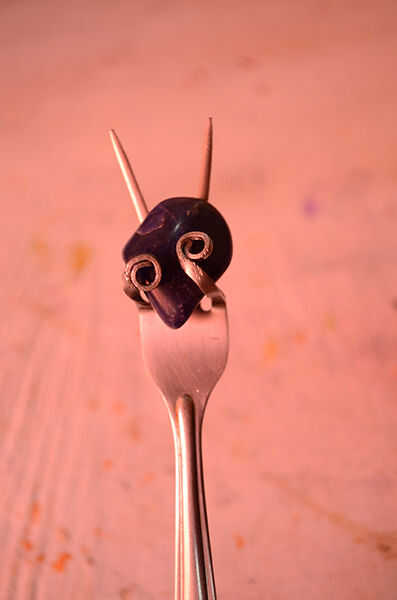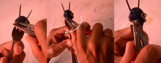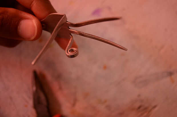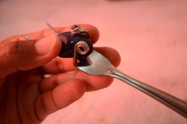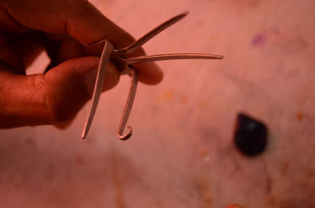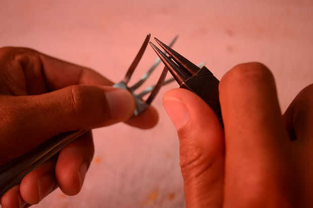 Ahora, doble el diente con el espiral hacia arriba de la piedra. Usar las imágenes como referencia. Hacer lo mismo con el otro diente externo.