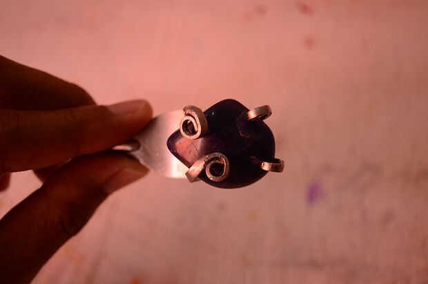 Lo mismo del paso anterior con las dos púas internas: Retuerza los extremos de las puntas y doblarlas hacia arriba de la piedra, esta vez sin torcer otra vez. No olvide girar el diente entero, dejando algún espacio plano **. El tamaño de este espacio será aproximadamente igual a la altura de la piedra preciosa en ese momento.