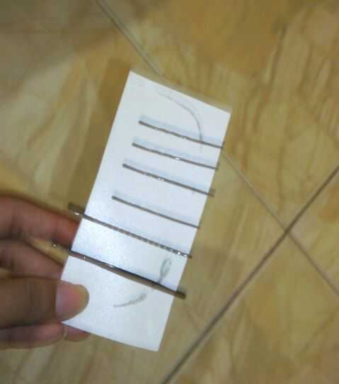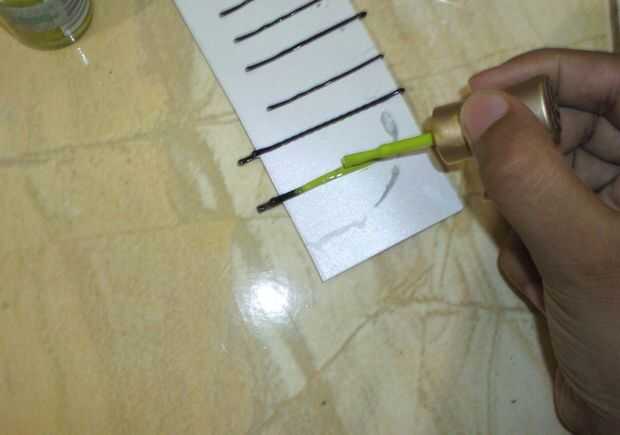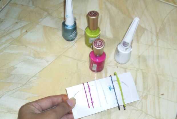 Pin horquillas en el tablero duro como se muestra en la imagen y comienzo pintando con esmalte de uñas. Dejar secar completamente durante 30 minutos y aplicar otra capa de esmalte de uñas.