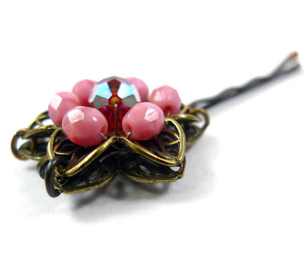 Pasar el largo del cable a la parte delantera de la cadena y la flor una pequeña cantidad sobre el cable. Utilice el hilo para coser el talón en la parte delantera de la filigrana. Repetir alrededor de la flor para agregar seis perlas de 4 mm en todas. Un nudo del cuadrado en la parte posterior de la flor y recorte el exceso de cable. Apartar la flor moldeada.