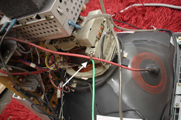 Un transformador flyback en el monitor genera pocos kV que se utiliza para acelerar los electrones en el CRT de la pantalla. Debe haber al menos dos grandes conductores que salen del transformador. Uno va hacia la ventosa cerca del frente de la pantalla (que es el súper alto voltaje uno), otro va hasta el extremo posterior del tubo (debe ser más o menos 0v).