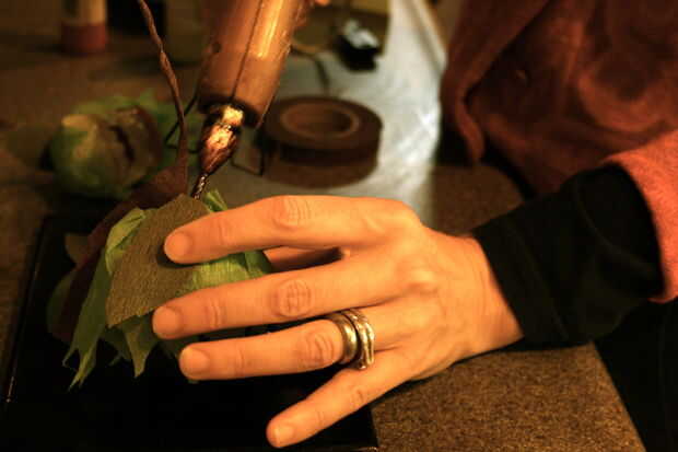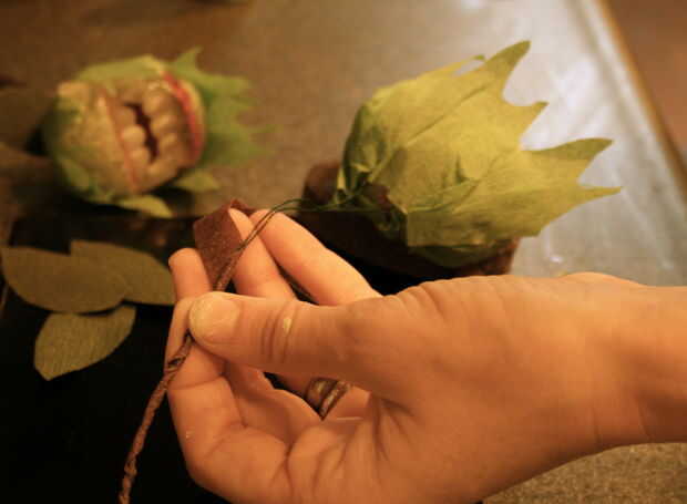 Pegamento en hojas y envuélvalo con cinta floral para terminar...