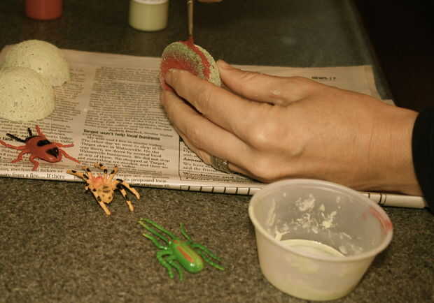 Pintar el verde exterior y el interior rojo... Añadir labios rojos a los lados cortados de las bolas. Déjelo secar.