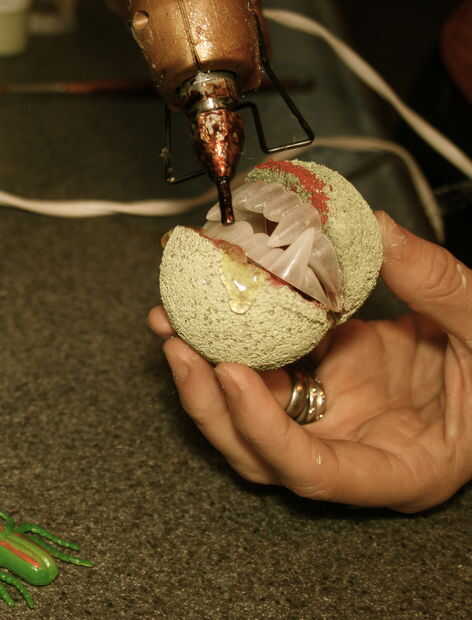 Utilice pegamento caliente en los frentes de colmillos para crear una ñoña babeando. Dejar que endurezca.