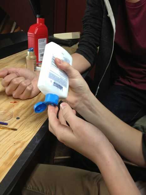 En primer lugar, aplicar loción para el artista que es composición de mano de la herida. Esto permite el modelado de cera evitar que se pegue a las manos del artista.