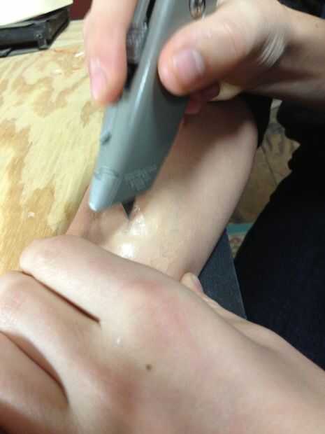 Después de proceder a aplicar un montón de cera, el artista cortará el montículo en la mitad con un cuchillo de plástico, o en este caso un cuchillo del exacto. Asegúrese de considerar la seguridad al cortar la cera ya está cerca de la piel. La brecha para el corte debe ser juzgada por el artista como por preferencia, no mide.