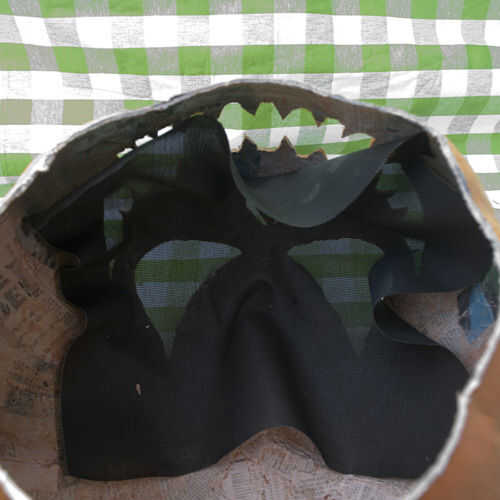 Nota: pegar alrededor de la nariz y un ojo, luego recortar la malla alrededor de las partes ya había pegado para pegar la siguiente pieza plana. Continué así hasta que la malla había sido pegada sobre cada abertura y las restantes piezas de malla se cortaron.
