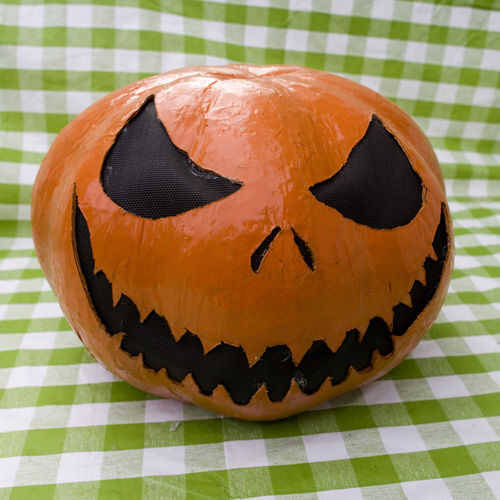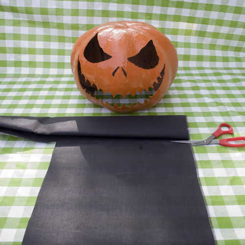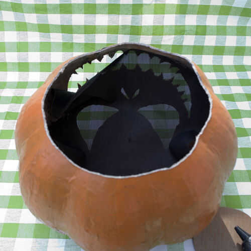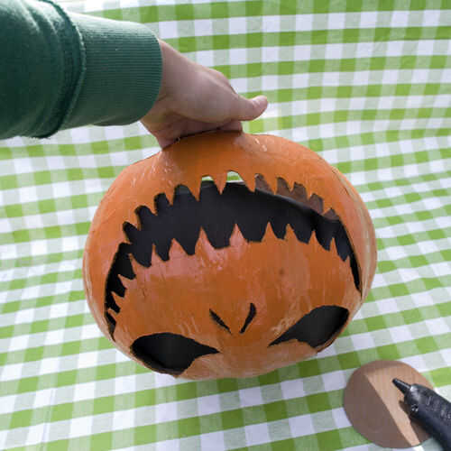 3. use la pistola de pegamento caliente para fijar la malla en el interior de la calabaza a partir del centro (zona de la nariz) de la cara de la calabaza.