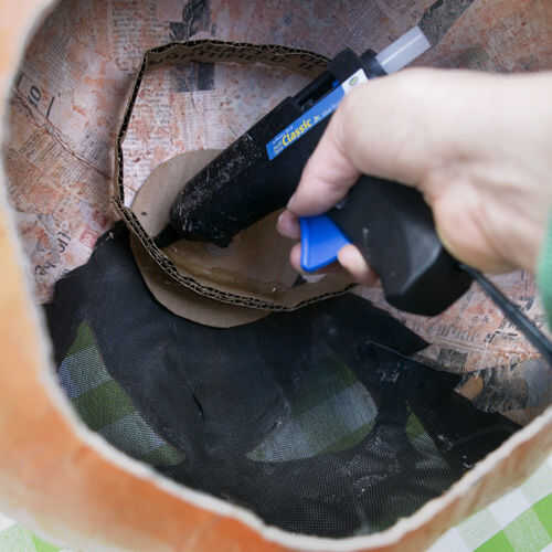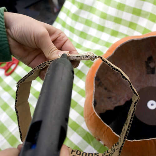 Nota: en la imagen siguiente usted verme caliente-pegar la corona para que la calabaza se centrarán directamente sobre mi cabeza. Esto no funcionó. Descubrí que necesitaba la calabaza para descansar mucho más adelante, así que tuve que extraer la corona y volver a pegar más atrás en la calabaza detrás de la madre.
