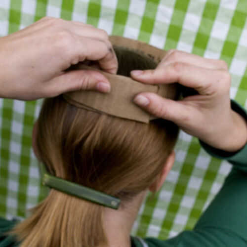 2. decida cómo suelta o apretada debe ser por el estiramiento alrededor de su cabeza y caliente-pegar en el lugar apropiado.