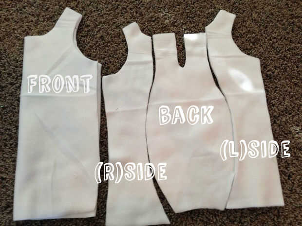 - Doble el material a cortar 2 de cada pieza. Esto es así puedes poner algún relleno de fibra o relleno entre cada pieza para dar el traje de su forma redonda.