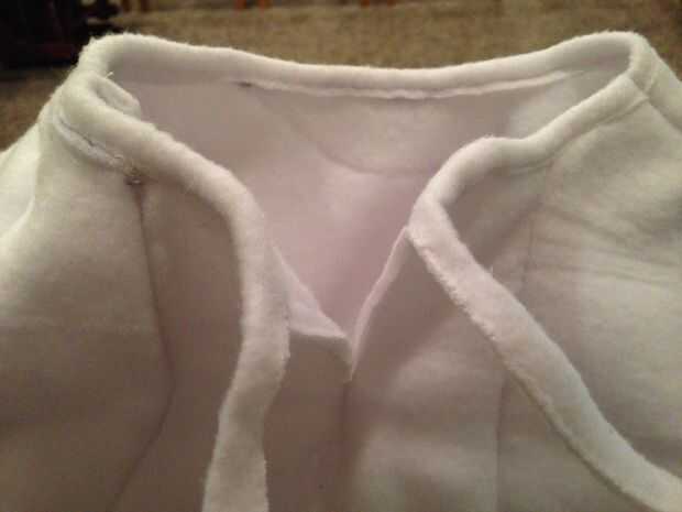 La raja o el ojo de la cerradura en la parte posteriora es darle a su habitación de bebé cuando quitándose el traje y ponerlo. El siguiente paso es terminar la parte superior del traje con una tira de acabado que actúa también como un lazo en la espalda.