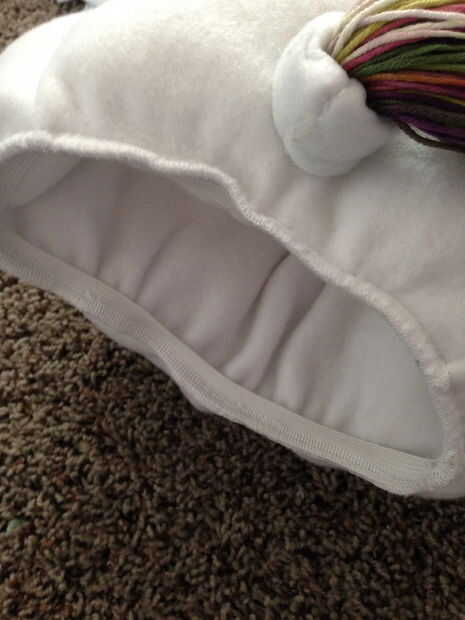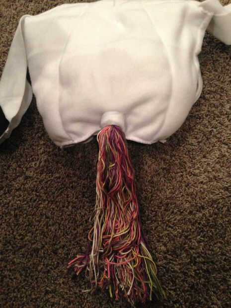 - La cola de caballo se hizo cortando tiras largas de lana luego caliente pegado a una franja de material blanco. Enrollar la tira de material y pegar cierre. Pegue la cola en la parte inferior del traje.
