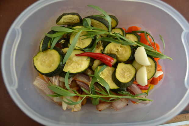 Presione ligeramente las verduras, esto no los dañará y necesita menos aceite más adelante. Añadir los dientes de ajo pelados y las ramitas de hierbas frescas (Romero, tomillo, estragón,...) a las verduras de sabor extra. Si te gusta caliente también puede agregar algunos chiles.