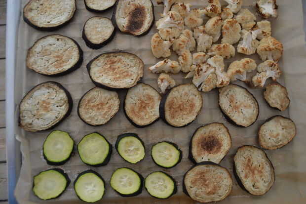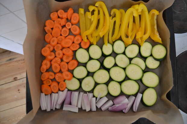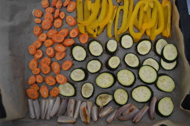 la cocción tarda unos 20-30 minutos pero puede variar, dependiendo del tipo y tamaño de las verduras en el horno...