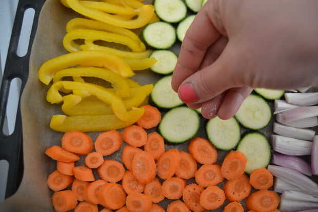 esparcir las verduras generosamente con sal y ponerlos en el horno precalentado.