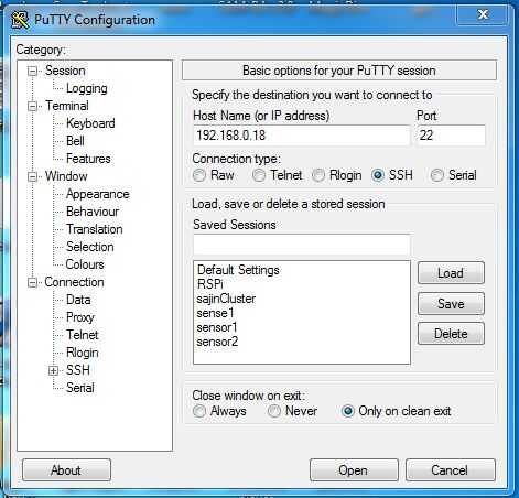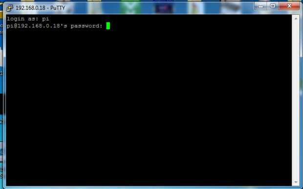 ahora debe tratar de abrir una sesión SSH mediante masilla para raspberrypi.local o la dirección IP de speccific (si tienes el HDMI conectado debe estar en le pantalla, o ir a la página de configuración del router (normalmente 192.168.0.1) y compruebe el frambuesa pi bajo DHCP). Usted puede acceder a la frambuesa pi con nombre de usuario: contraseña y pi: frambuesa.