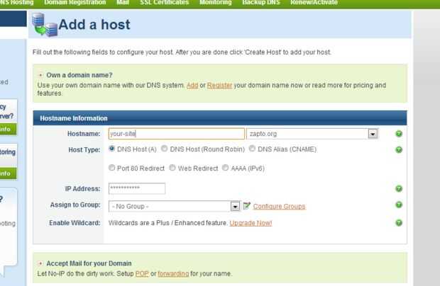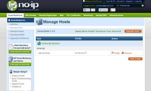 Ahora tienes un sitio web que se puede acceder desde Internet, pero la mayoría de ustedes (como yo) no tiene una dirección IP estática (su demasiado cara), que significa cada 1 día o así, el ISP podría cambiar su ipaddress(gateway) por lo que canto siempre escriba la dirección IP y esperar a ver su sitio de Internet, para solucionar esto utilizamos un servicio de no-ip que se instala en la frambuesa pi. Este servicio se ejecuta en la frambuesa pi y dice que el servidor no-ip cuál es su dirección IP. No-IP te da un nombre de dominio que se apunte a tu IP actualizado pasado, todo lo que tienes que hacer en hacer una cuenta gratuita en