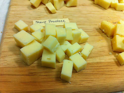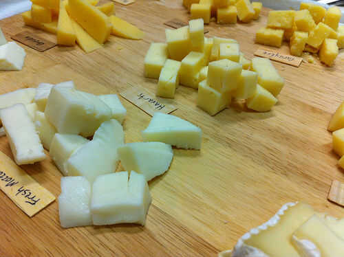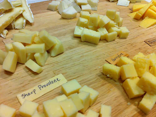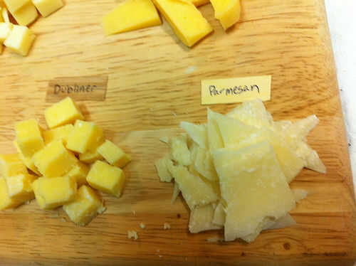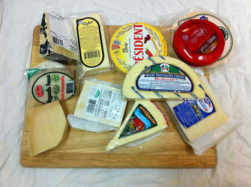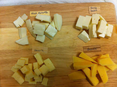 Aquí están los quesos que yo elegí, en orden áspera de suave a firme: sharp de brie, queso de canasta, fontina, mozzarella fresca, havarti, gouda, provolone, gruyere, dubliner y parmesano (Asegúrese de que es real echa por "Parmigiano Reggiano" estampada en la corteza)