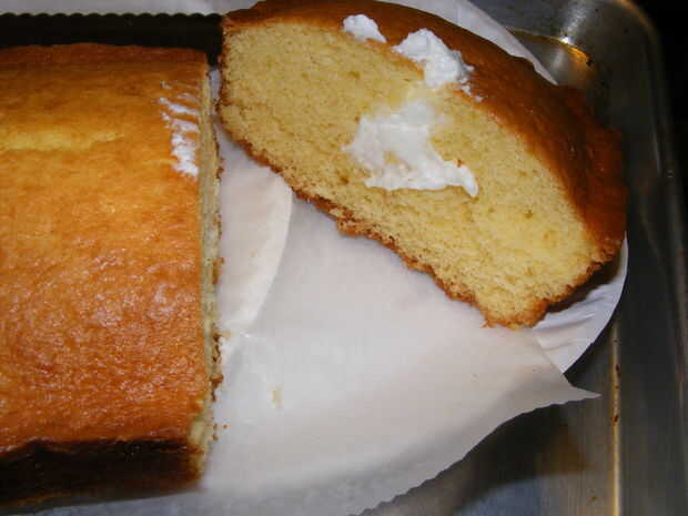 creo que los ingredientes del crema como relleno siguen siendo un secreto pero hay mucho lore urbana que puede leer en la red. Sólo usé una lata de crema batida topping para este gigante Twinkies. Viene con el aplicador de inyección y se presuriza para fácil aplicación. Escoge tres puntos en la parte superior de los Twinkies pastel para inyectar el relleno de crema para batir. Que tenga que sondear un poco con la punta para agrandar la cavidad donde va el relleno. Es como dice en la botella de cola, aplicar con moderación, lo que significa. Cuando se hace, como un verdadero Twinkies, invertir la torta entera para que la parte moldeada es ahora la parte superior de la torta.