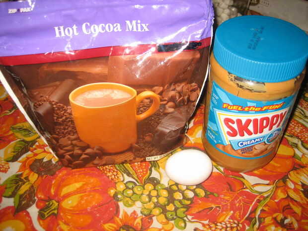 Todo lo que necesitas es alguna mezcla de cacao caliente 1C, una especie de mantequilla de tuerca 1C y un huevo grande. Haz un tazón y mezcla que todo muy bien, lo debe ser una masa espesa como masa. Sacar piezas tamaño puñado y les Hornee a 375° por 10-12 minutos, luego disfrutar.