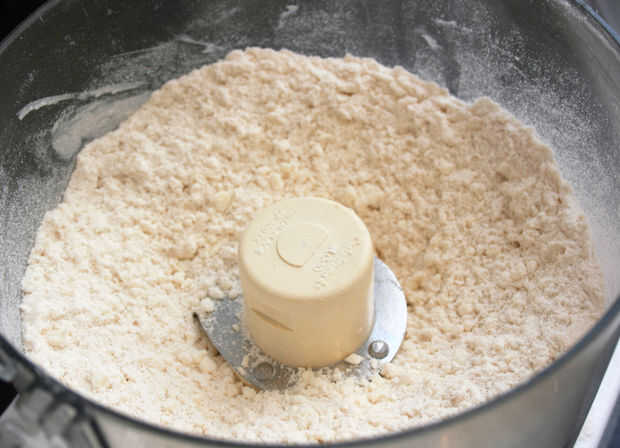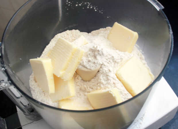 Pulso juntos harina, mantequilla y sal hasta que la mezcla se parece a comida grueso con el resto en trozos de tamaño de un guisante.