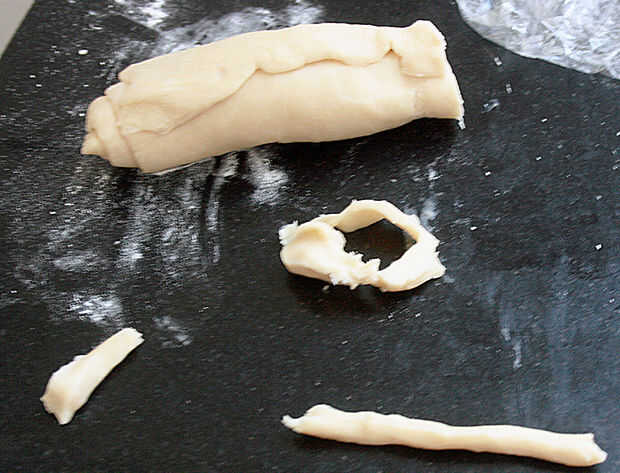 Cortar masa transversalmente con un cuchillo de pizza cortador o sharp en 1/8" ancho tiras.