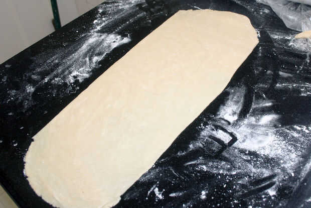 Estirar la masa de hojaldre sobre una superficie enharinada a un rectángulo de 20 "x 6", aproximadamente 1/8" de espesor.