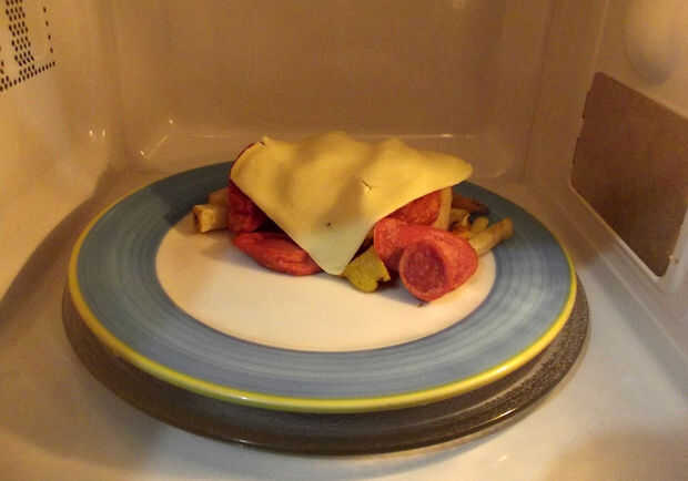 Servir las papas, salchichas, jamón y chorizo en un plato y poner el queso. Ponerlo en el microondas durante al menos 30 segundos para derretir el queso.
