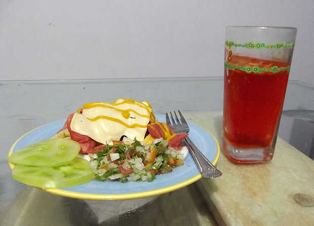 Añadir algunas rodajas de tomate verde (solo porque me encanta), la salsa (y tus salsas solicitadas, parecida a la mostaza) y acompañarlo con un vaso grande y frío de Refajo.