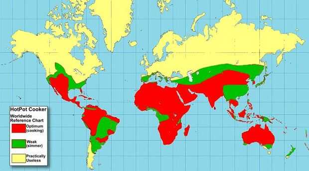Pero no es tan simple como latitud. Consulte el mapa global práctico, que indica la cantidad de energía solar eficaz, en horas, recibe cada día en una superficie de panel fotovoltaico inclinado óptimamente durante el peor mes del año (basado en datos de acumulados insolación solar en todo el mundo). Sin embargo, con la cocina solar de Hot Potatoes, las horas, publicadas en el mapa mundial se pueden, por el contrario, tomar libremente como las horas cocción diarias eficaces, durante el mes de mejor/WARMEST del año. Rápidamente esto explica por qué HotPot™ propietarios en Arizona y nuevo México dan comentarios que brilla intensamente de este dispositivo, mientras que los propietarios de HotPot™ en Estados sureste (misma latitud), de los Estados Unidos o Brasil, o España o China, tranquilamente vuelva su s HotPot™ y enviarlos nuevamente el su minorista.