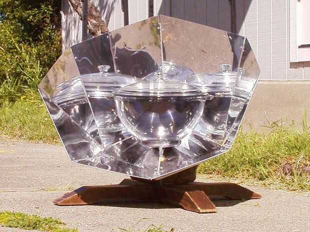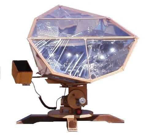 El ensamble de la caja se apoya en el reflector de aluminio pulido. Allí es también un reflector estándar menos costoso, hecho de papel de aluminio consolidado a cartulina pesada, pero no aparece aquí. Tienen forma de reflectores para concentrar la energía solar en el bote, son igualmente eficientes, tanto tanto doblan fácilmente para el almacenaje.