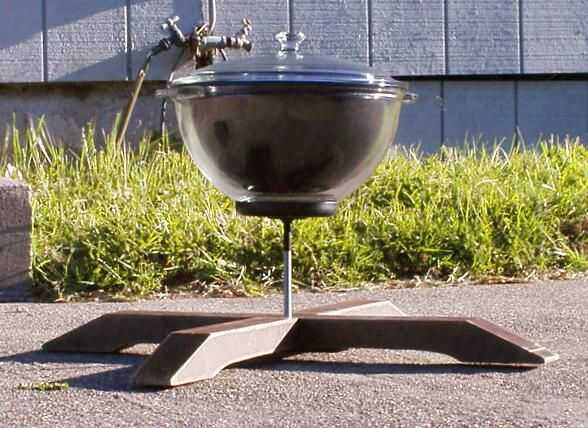 Así, para cocinar en mi casa, en la zona templada (Latitud: 37,5 ° Norte), he taladrado un orificio de 1/2" diámetro, en el centro del reflector plano base, 3" adelante del centro. Luego taladrar un orificio de 3/8" en el centro de un cuatro patas madera base sólida, de una vieja silla e inserta un 6-1/2" largo, estándar 3/8" roscado barra, vertical (perpendicular al suelo), con el Hot Potatoes sobre la parte superior de la tubería, en un invertido redondo negro acero base de la lámpara, atornillada a la parte superior, que se ajusta a la parte inferior de cristal del Hot Potatoes. El negro Lámpara improvisada base realmente es el mejor lugar en el proceso de cocción, como el agua comienza a hervir, como bien como intenso calor se levanta para arriba del metal base y en el área de doble pared de 1/2" de la taza. Aprovechando este efecto, spray pinta la parte superior de 1-1/2" de la tubería roscada de la lámpara, así como el soporte tuerca y arandela, azabache. El reflector de aluminio plegable puede ahora con seguridad periódicamente inclinado y girado para enfocar los rayos del sol, mientras que el estofado hirviendo firmemente y con seguridad permanezca inmóvil. Esto proporciona un potencial para una ventana de cocina 3-5 horas, dependiendo de la época del año y latitud.