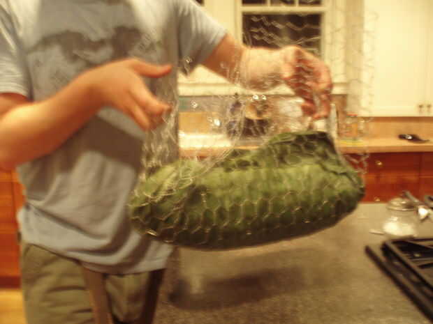 En primer lugar, colocar un cuadrado de alambre de pollo, cerca de 2 pies en un lado. Se puede omitir este paso, pero hace manejo de la carne de cerdo cocinada mucho más fácil.