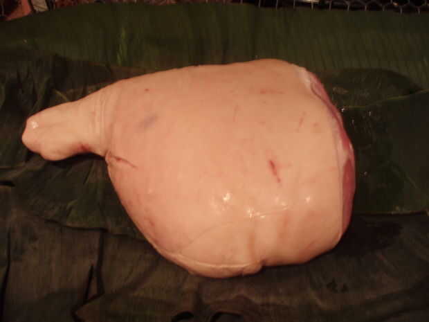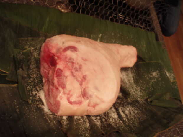 Lugar la espaldilla de cerdo en el centro del plátano hojas. Si un lado tiene mejor cobertura de la piel, poner ese lado hacia abajo. Ahora sal de la carne generosamente. Pensar acerca de cuanta sal necesita condimentar la carne a través de y... No agregar otros aliños. Sé que puede ser difícil para la mayoría de los fanáticos de la barbacoa, pero confía en mí, con este método que el hojas de plátano y la sal son todos los sabores es necesitados. Puede salsa la carne más tarde cuando se cocina y se tira si quieres.