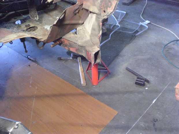 Corte la suspensión stock a continuación, este paso necesita no ser aseado, cortar con una sierra de sable, luego configurar su nuevo mustang dos frontales travesaño sobre un gato y gato en posición utilizando la plomada y cinta métrica para obtener centrado en las líneas de proa y popa y de lado a lado y a la altura correcta , Opté por dejar caer el coche por una pulgada así que tuve que levantar la interfaz a 19.5 pulgadas usted debe recordar a añadir a estas medidas la altura que te JACKEAR el coche para arriba. Mis gatos habían levantado el coche por siete pulgadas por lo que una vez que añadí el 19.5 al 7 mi huso sentó a 26,5 pulgadas. Esta foto es sin el travesaño en lugar mirando hacia el lado del conductor, tenga en cuenta también que el túnel trans es falta.