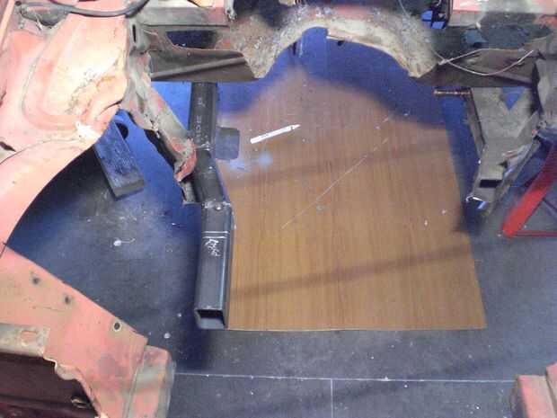 usando la plomada y un nivel seguí rectificado el ángulo tubo cuadrado de 3/16 pared 2 x 3 hasta que me dieron en el travesaño de montaje pieza exactamente 8 1/2 pulgadas de la línea central del vehículo y paralelo. el truco para esto es no para cortar el ángulo entero en una sola pieza. Esto es porque el ángulo de corte pieza no satisfaría la pieza cortada recta muy bien. en su lugar, cortar la mitad de cada ángulo en ambas piezas, por ejemplo; un ángulo de 15 grados necesita dos piezas de corte a 7 grados y en el mobiliario final. al mismo tiempo es necesario mantener control de la altura del marco para que el travesaño se reúne cuando el eje se puede montar a la altura deseada. la marca blanca en mi trabajo es donde la sacudida dice que es el centro del árbol.