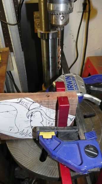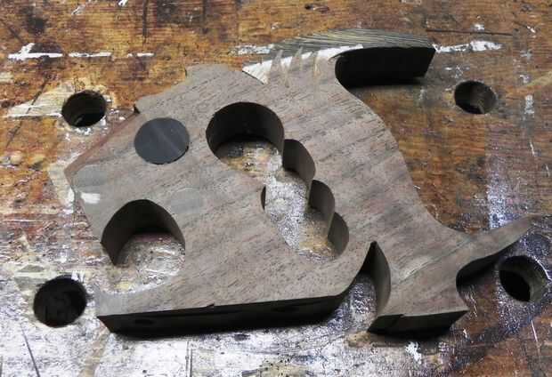 Para imitar el aspecto de las tuercas de retención, diámetro 3-4 orificios en la parte delantera y se llenan de espigas o clavijas. Tuve unos 7/8" blackwood da vuelta los espacios en blanco por lado usé uno para la tapa grande. Una vez el espacio en blanco es montado y seco, utilizar un router para ronda sobre las áreas que llegará a su mano. Siguen la forma del bloque con una Dremel y lija hasta que estés satisfecho con el resultado.