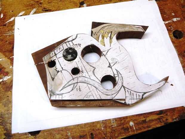 Cortar el cuerpo primero, luego retire la plantilla y sustituirla en la pieza contrastante de la madera. Corte a lo largo de la línea utilizada antes y coincida con las dos piezas entre sí. Porque el wenge es tan difícil, que tenía que hacer algún ajuste al final para que encajen juntos. Utilizar pegamento de poliuretano para unir las mitades juntos y agregue epoxy en el exterior para cualquier chuletas restantes.