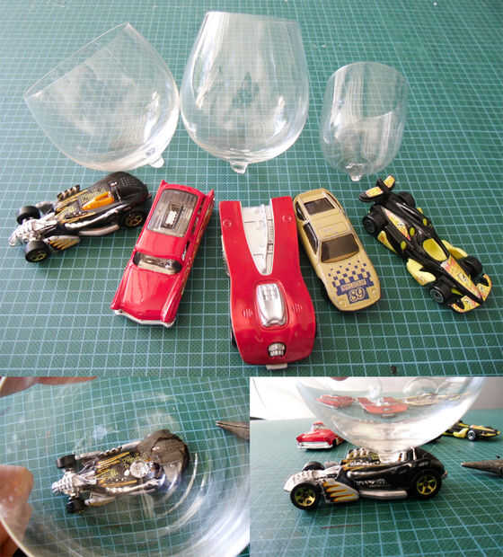 Dependiendo del material de coche puede quitar algún plástico del coche para permitir que el vidrio para adaptarse más cómodamente. En la foto que se muestra a continuación, el pabellón naranja de la carrera de coches fue quitado para permitir que la esencia de madre caber.