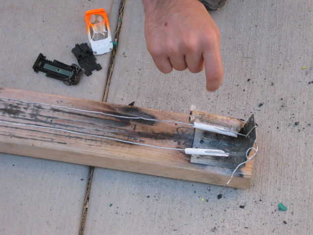 ahora todo lo que tienes que hacer es poner el coche en la pista. Cuando Envuelva el cable alrededor de la pieza de metal en beore usted hace otra cosa Revise todos los photogates y asegúrese de que funcionen correctamente. Beinging de yor pista, asegúrese de que no esté demasiado apretada o bien el coche no va ir a cualquier parte. Justo antes de permitir el auto se apagara haga clic en el softwere de la fotopuerta vernier y asegúrese de que está grabando entonces claro el cohete.