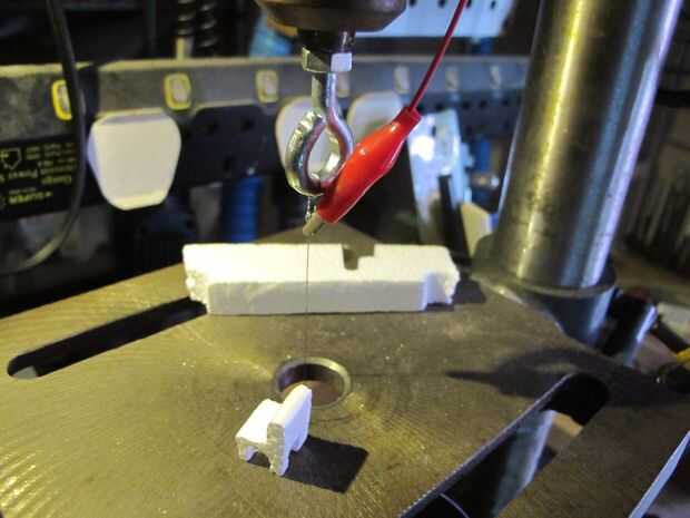 El concepto general es con la etapa de taladro como fase de corte y sujetar un alambre caliente entre el taladro y la base.