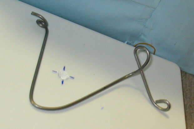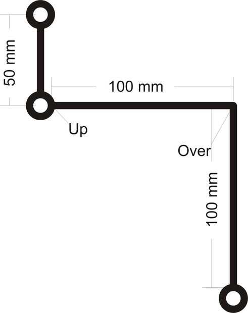 La barra de la curva por lo que tiene lo suficientemente grande para un perno de 5mm ir a través de dos lazos. Uno al final y otra 50 mm en (estas se alinean con los agujeros que ha perforado). A continuación doblar la barra pasa por 10 cm, entonces de 10 cm y luego doblar otro bucle en el extremo. La precisión no es particularmente importante ya que cualquier pequeño desalineaciones se pueden ordenar después del montaje