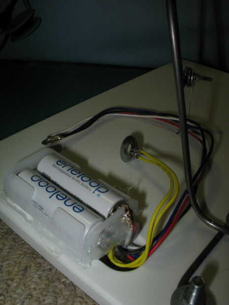 Fije un trozo de cable a cada uno los terminales positivo y negativo de soporte de la batería. Una longitud de alambre debe ser lo suficientemente largos para llegar al hoyo en el centro de la tabla de cortar. El otro debe ser lo suficientemente largos para llegar al orificio en la parte superior de la Junta. (Os adjunto las arandelas al final de estos cables para facilitar la adjuntarlos, puse una arandela grande en la longitud más corta y utilizarlo como un simple en apagado)