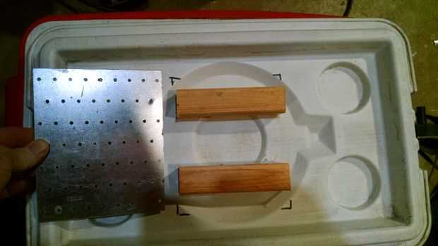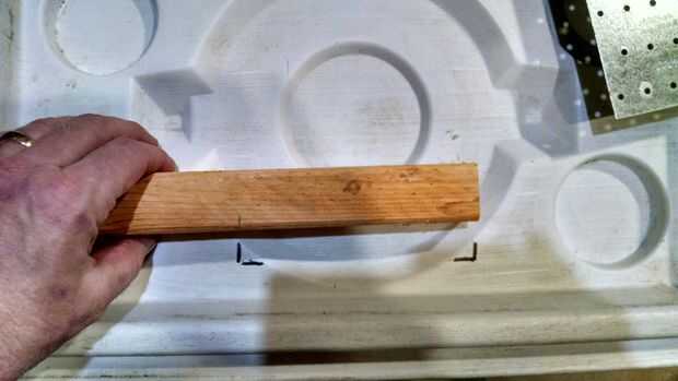 Una vez que se marcan las esquinas de la placa, medir y colocar un trozo de 2 x 2 en la mejor ubicación. Trate de mantener tan plano como sea posible. No necesita ser perfecto, sólo plano del metal que se unirá a él. Me aseguré de que los agujeros en la placa alineadas cerca del centro de 2 x 2. Entonces marqué las esquinas de 2 x 2 en la tapa para referencia para localizaciones de perforación.