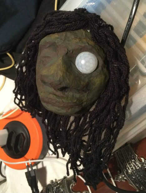 Mi objetivo era hacer una cabeza encogida malhumorado similar a colgar a los pomos de las puertas en la película de animación Hotel Transilvania. Para hacer que me decidí a esculpir una cabeza, hacer una máscara con papel maché / colée, y dentro de esta forma el sistema de sonido, sensores y electrónica. Oh sí, habla! :)