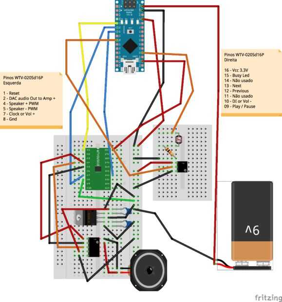 Básicamente me enganchado el reproductor de wav, sensor PIR y luz sensor para arduino, el amplificador de sonido para el reproductor de wav y el altavoz al amplificador. También adaptó una batería 2AA interruptor de encendido para una batería de 9V y utiliza como fuente de energía única. Para lo que tenía que hacer un circuito rectificador de voltaje pequeño, bajar los 9V a 5V para alimentar el amplificador (voltaje máximo soportado 6V). El arduino maneja 9V por defecto.