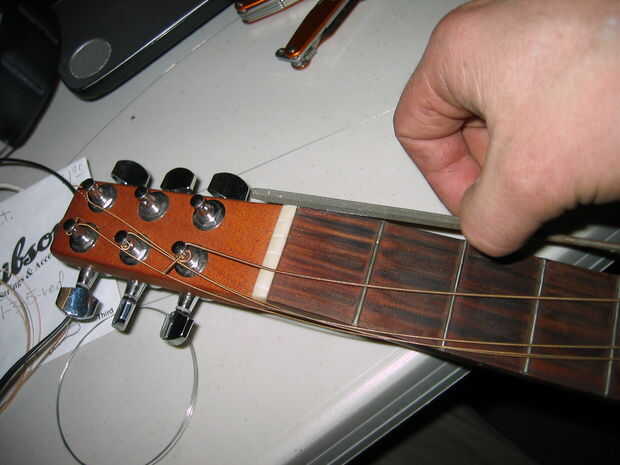 Si sólo tiene acceso a la que está trabajando, sólo gradualmente por las muescas en la tuerca y el puente hasta que te gusta es baja. Si wittle demasiado baja puede poner una gota de pegamento en la ranura y deje que se seque. O poner un trozo de papel debajo de la cadena.