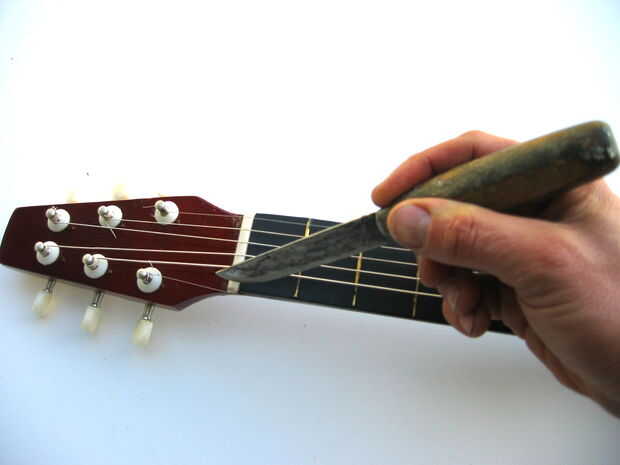 Aquí estoy tallando por la muesca de la tuerca de la guitarra de penny. Puede utilizar un archivo triangular si tienes uno.